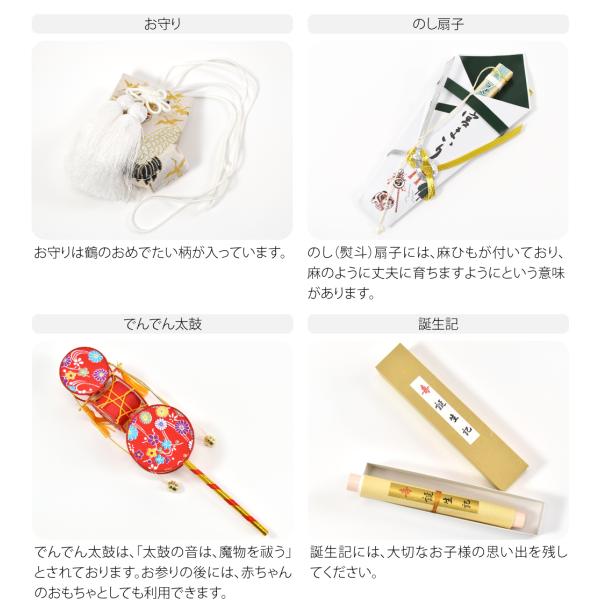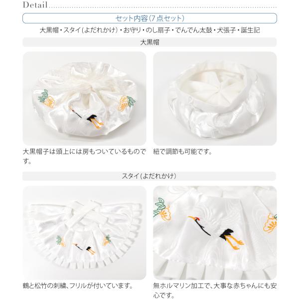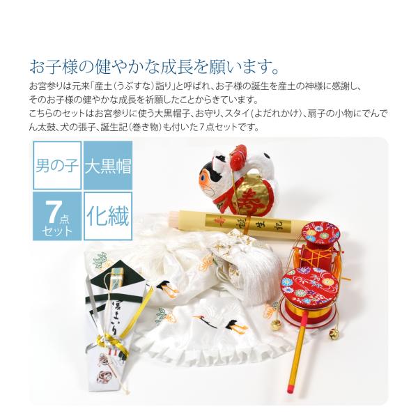 お宮参り フードセット 通年用 日本製 男の子 7点 化繊 大黒帽 産着 小物 帽子 よだれかけ お守り 扇子 でんでん太鼓 犬張子 誕生記 ベビー