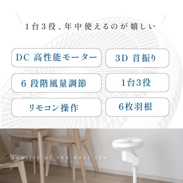 扇風機 DC 3D首振り 超静音 リビング扇風機 サーキュレーター 超静音 新色登場 卓上1台3役 高さ調節 6段階風量調節 USB給電式 リモコン爆買