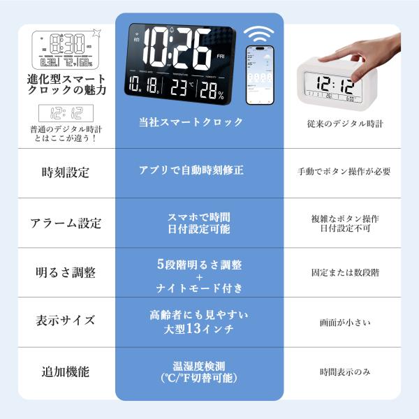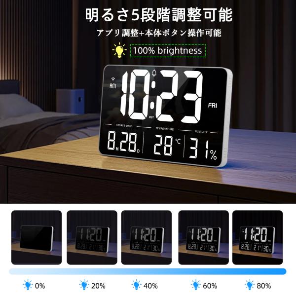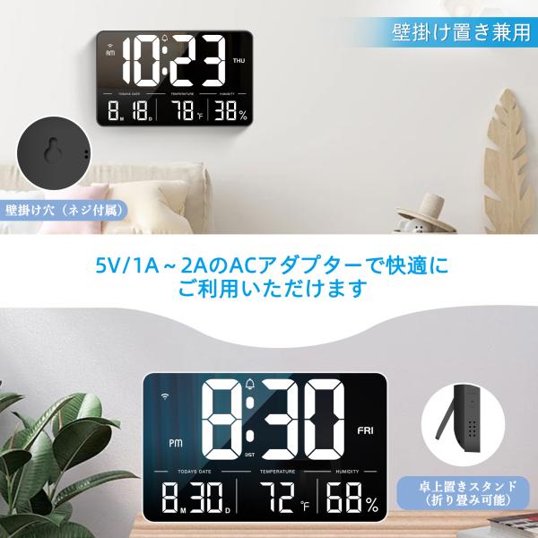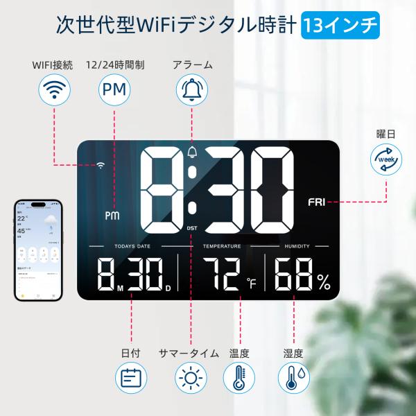 デジタル時計 壁掛け 大型 WiFi 自動時刻修正 アタブター付き 時計 13インチ 12H/24H時間表示 置き時計 目覚まし時計 明るい アラーム 温度計 大画面 業務 爆買