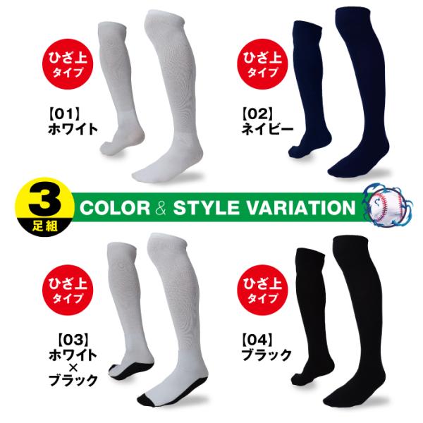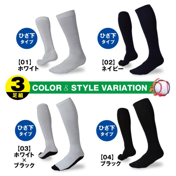 野球 ソックス 靴下 3足セット 補強糸 丈の長さが選べる ジュニア キッズ 大人 ベースボール アンダー ストッキング ホワイト ネイビー ブラック
