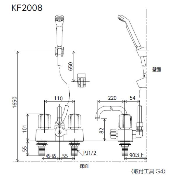 2ハンドルシャワー デッキタイプ 浴室水栓 KVK KF2008 220mmパイプ付き 可変ピッチ式 取付ピッチ 100mm 120mm対応