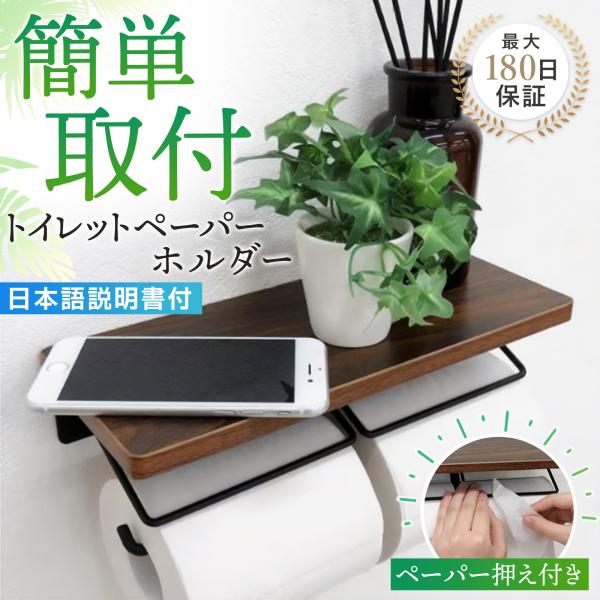 トイレットペーパーホルダー 2連 おしゃれ 棚付き ダブル DIY シンプル 木製 北欧 取り付け 天板付き ペーパー押え付き