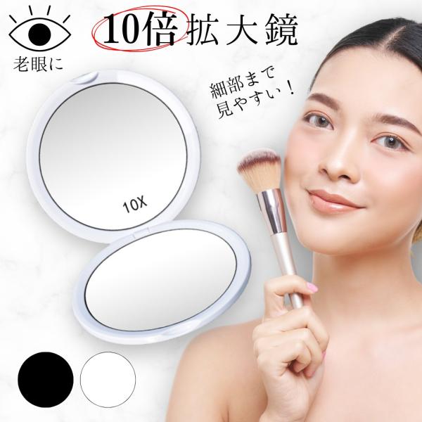 拡大鏡 ミラー 10倍 手鏡 折りたたみ メイク 化粧 コンパクトミラー 持ち運び 携帯 白 黒 シンプル 薄型 軽量 老眼 鏡 拡大 ギフト プレゼント 円形 丸型