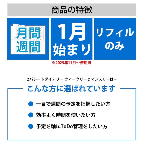 手帳 セパレートダイアリー 2026 1月始まり B6 ウィークリー&マンスリー リフィル 中身のみ スケジュール帳