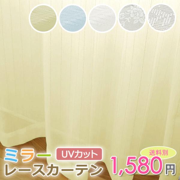 ミラーレースカーテン 2枚セット イエロー ブルー 花柄 リーフ柄 UVカット