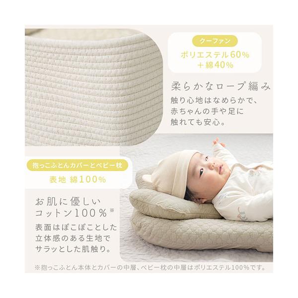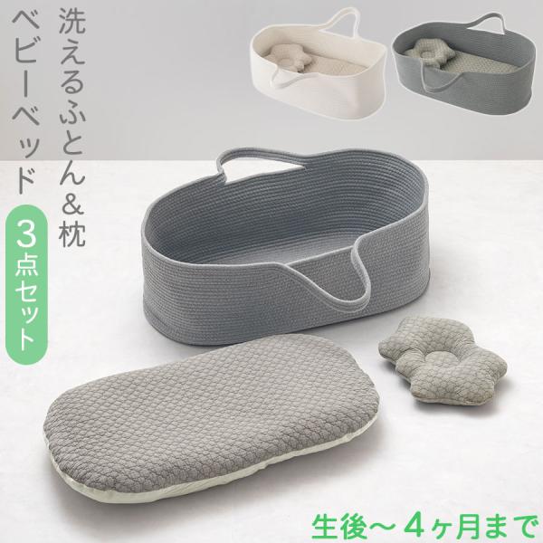 クーファン かご ベッド ベビークーハン ゆりかご 赤ちゃん ベビーベッド キルトパッド ベビー枕 洗える 3点セット ロープ編み 持ち手付き イブル生地