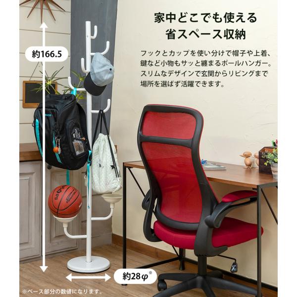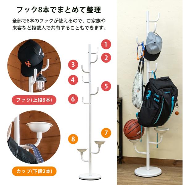 ポールハンガー ボールスタンド付き コートハンガー ハンガーラック 小物収納カップ付き ボール置き バック 帽子 洋服掛け 玄関 スチール 白