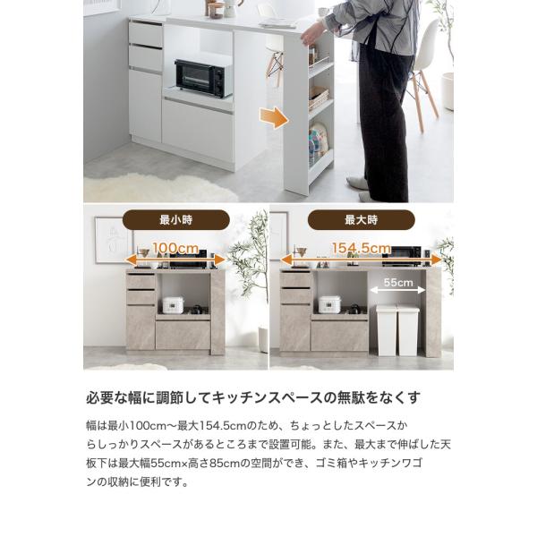 キッチンカウンター 伸縮式 レンジ台 キッチン収納 コンセント付き 間仕切り テーブル ゴミ箱上 アイランド 対面式 調理台 作業台 スライド棚 伸長 伸びる