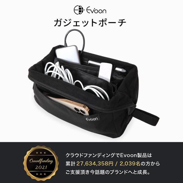公式 Evoon かわるガジェットポーチ ブラック ポーチ メンズ 男性 スマホポケット 自立構造 大容量 多機能 多収納 撥水 防傷 防汚 YKK 止水ファスナー