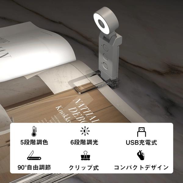 読書ライト LED ライト 読書灯 クリップ ブックライト 充電式 角度調整 6段階調光 5種の色温度 目に優しい 寝室 読書 照明 小型 軽い