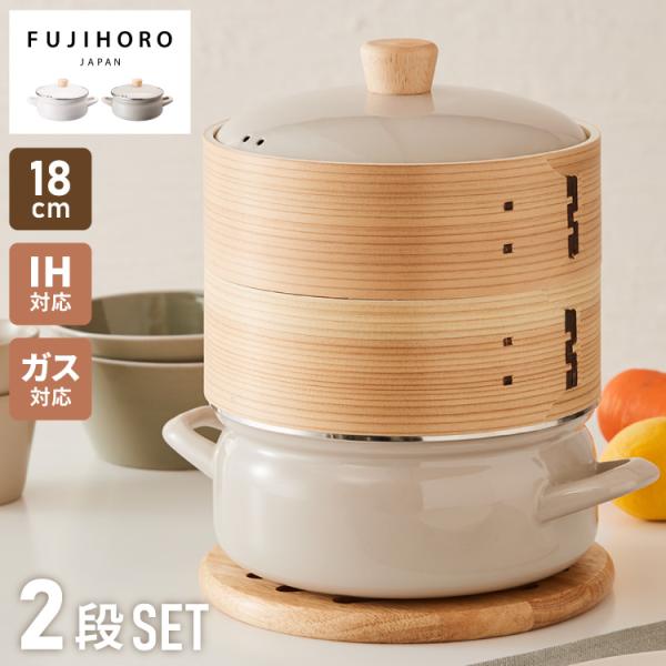 レビュー&報告で燕三条製トングプレゼント 富士ホーロー せいろ付きホーロー鍋 2段 セット 18cm 蒸し器 蒸し鍋 竹 せいろ 蒸篭 せいろ蒸し