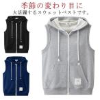 スウェットベスト メンズ ノースリーブ パーカーベスト フード付き 前開きベスト ジップアップ レイヤード ジレ トップス ゆったり アウター 重ね着