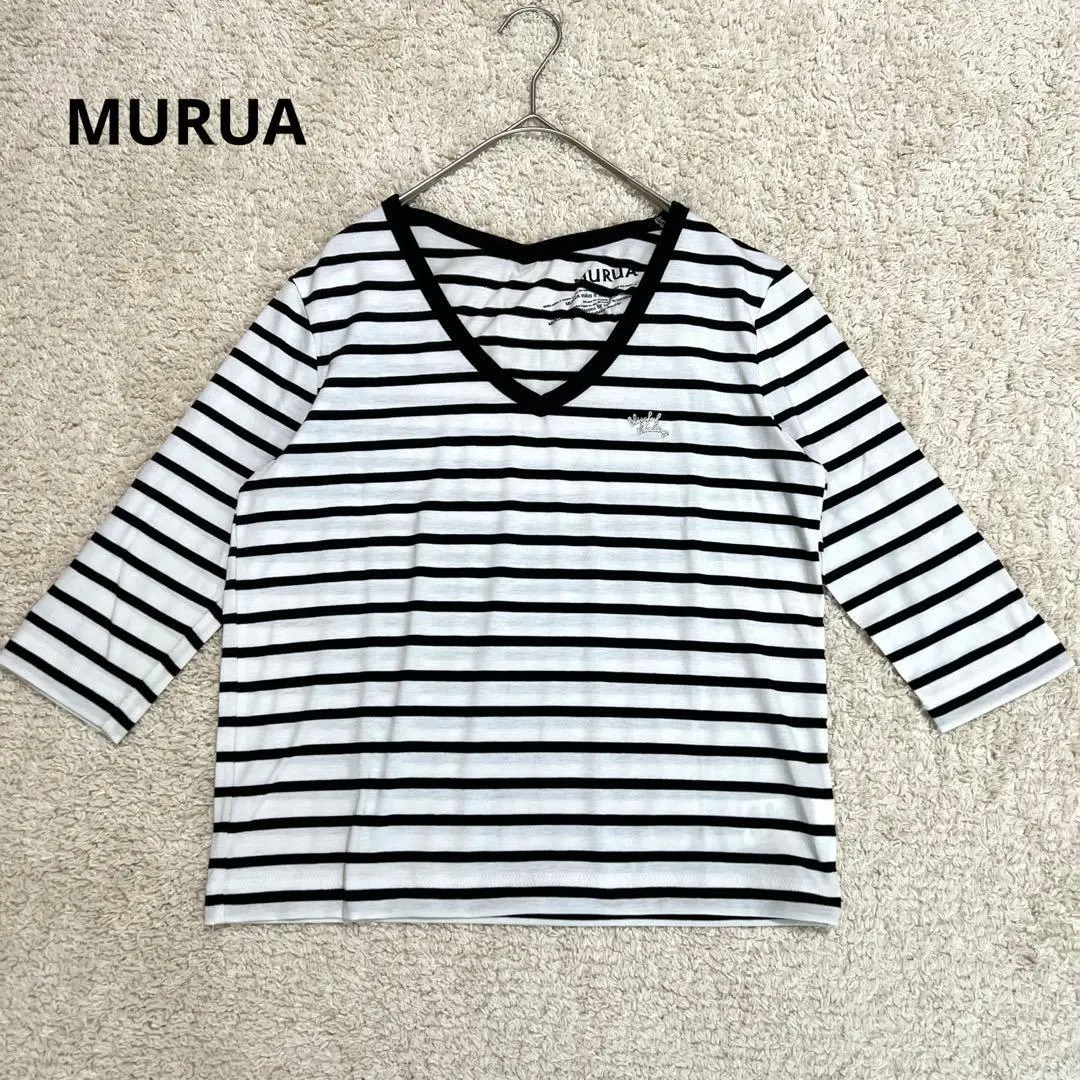 【MURUA】ムルーア ボーダーT Vネック ホワイト×ブラック 七分袖