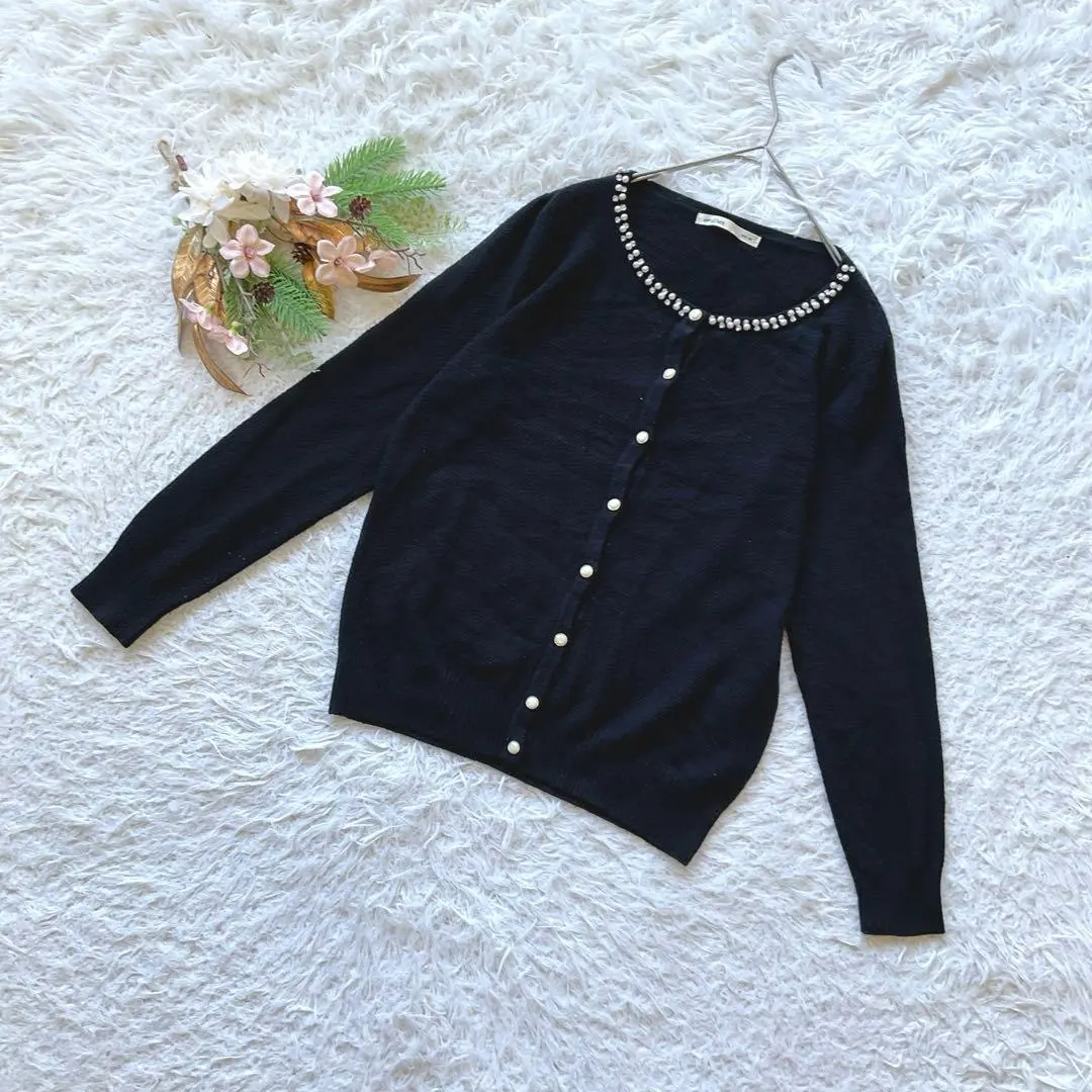 【ウイエ】 (M) 長袖カーディガン パール付き 上品 ビジュー フォーマル 黒