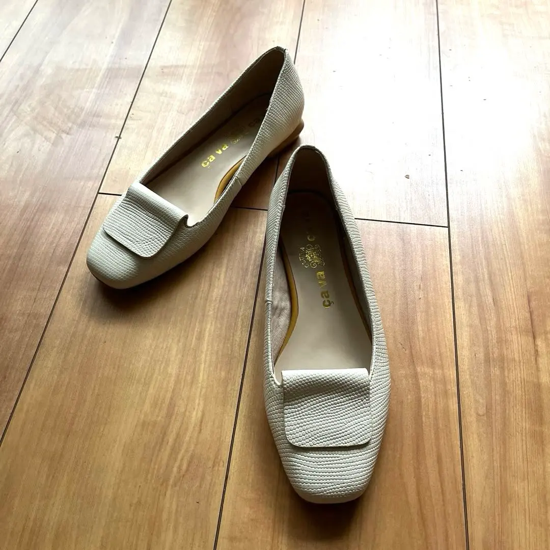 cavacava ローヒールパンプス スクエア アイボリー 型押しレザー