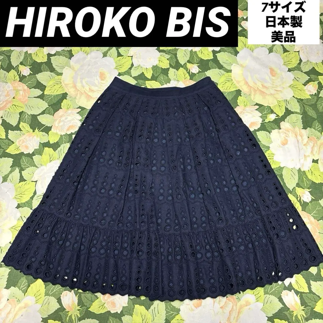 美品【値下げOK】HIROKO BIS 刺繍フレアスカート 7 ネイビー 日本製