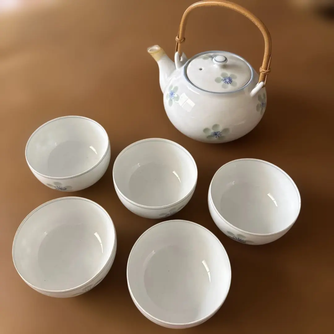 陶器製急須と茶碗5個セット 梅柄 昭和レトロ