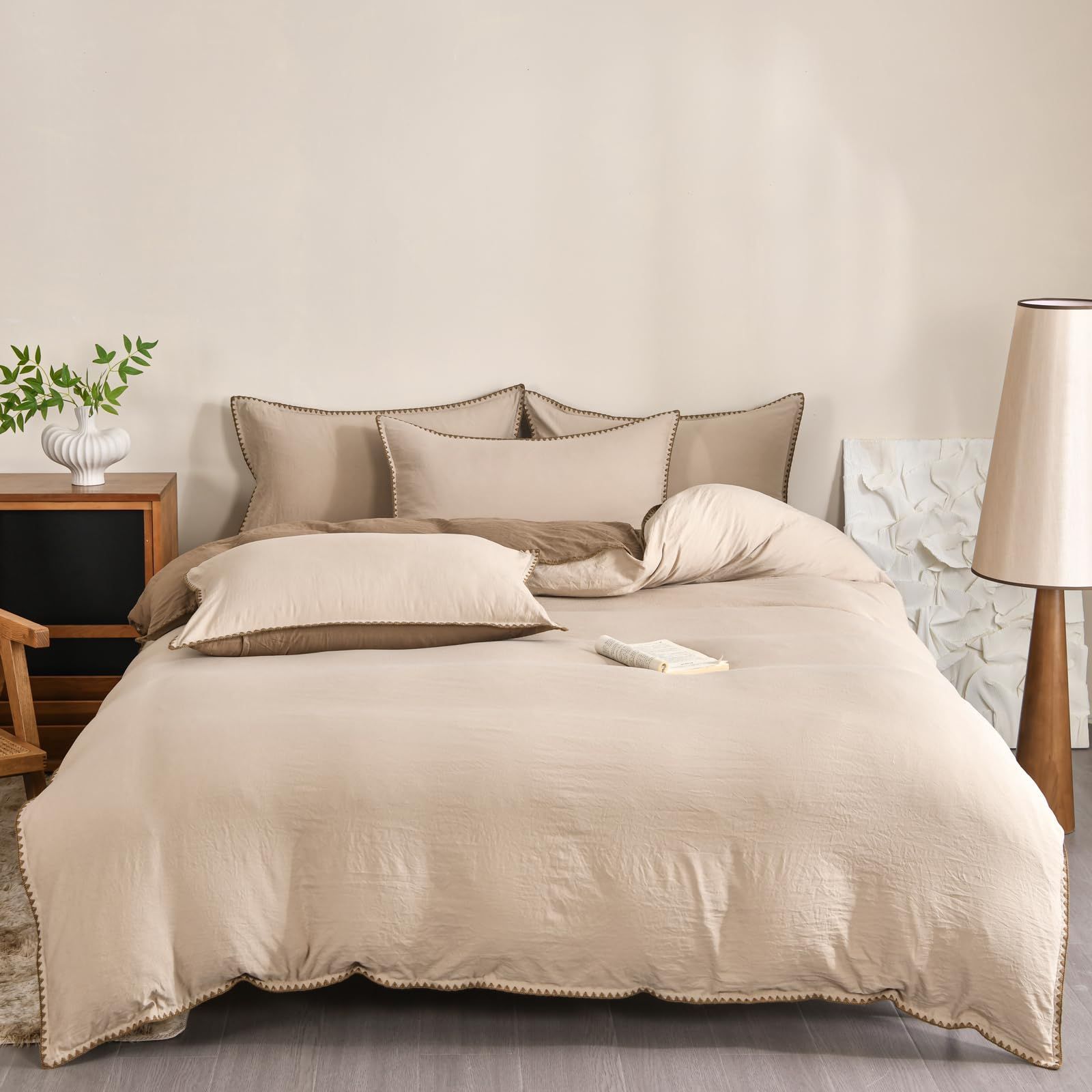 Ovege 布団カバー 3点セット シングル 掛け布団カバー ボックスシーツ 枕カバー 洋式・和式兼用 2方向ジッパー マイヤール ワッペン縫い 100%マイクロファイバー ピーチスキン加工 洗い替え速乾 ベージュ*ブラウン