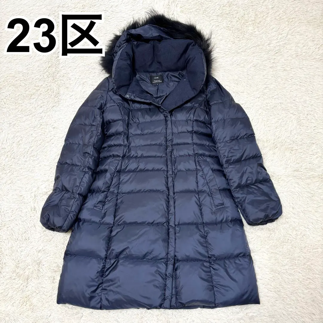 23区 ダウンコート フード リアルファー タヌキ Aライン ダークネイビー L