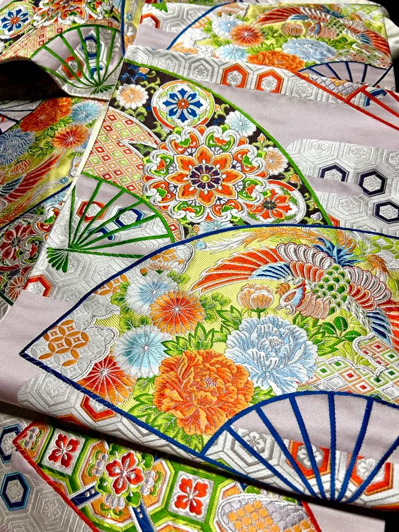 西陣 藤井敏織物 唐織 銀糸 華やかな扇子と草花と鳳凰 六通柄袋帯 証紙有り
