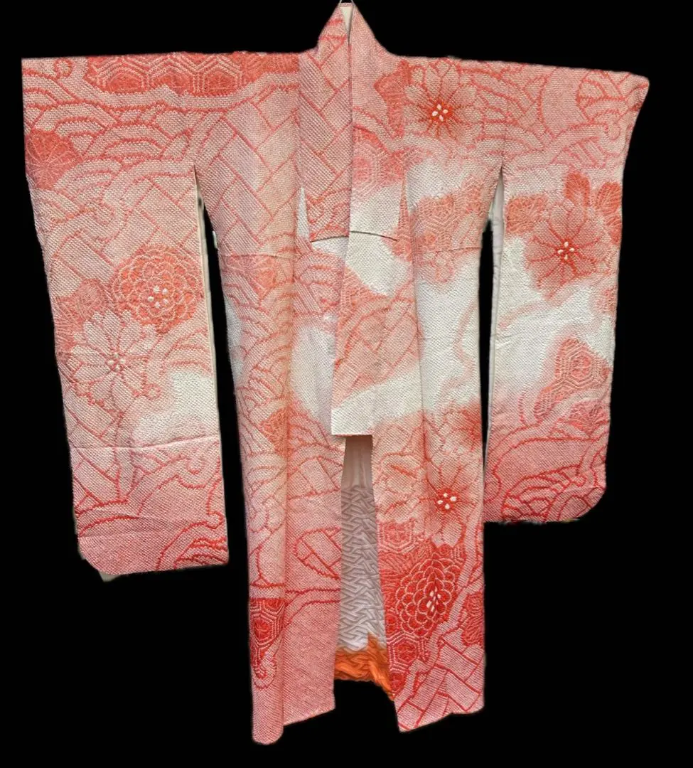 最高級 総絞り 身丈156㎝ 裄丈 66㎝オレンジ系 花柄 振袖 着物 正絹