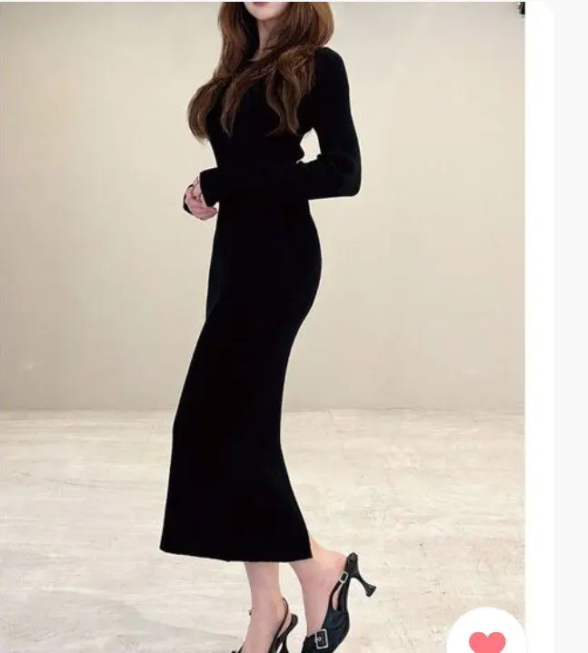 ブラックバックスリット ニット ロングワンピース 長袖