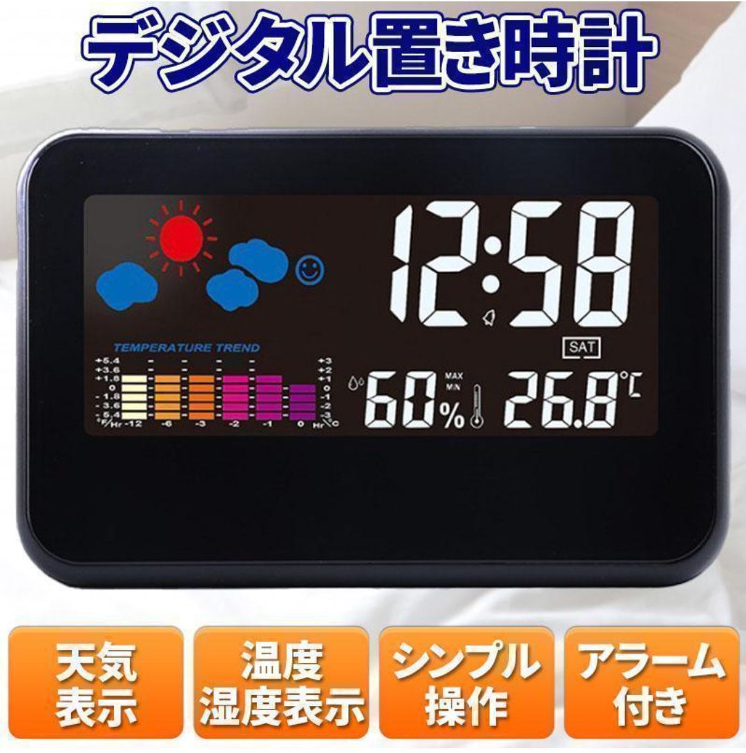 デジタル 多機能 置時計 黒 温湿度計 アラーム 天気予報 LEDバックライト