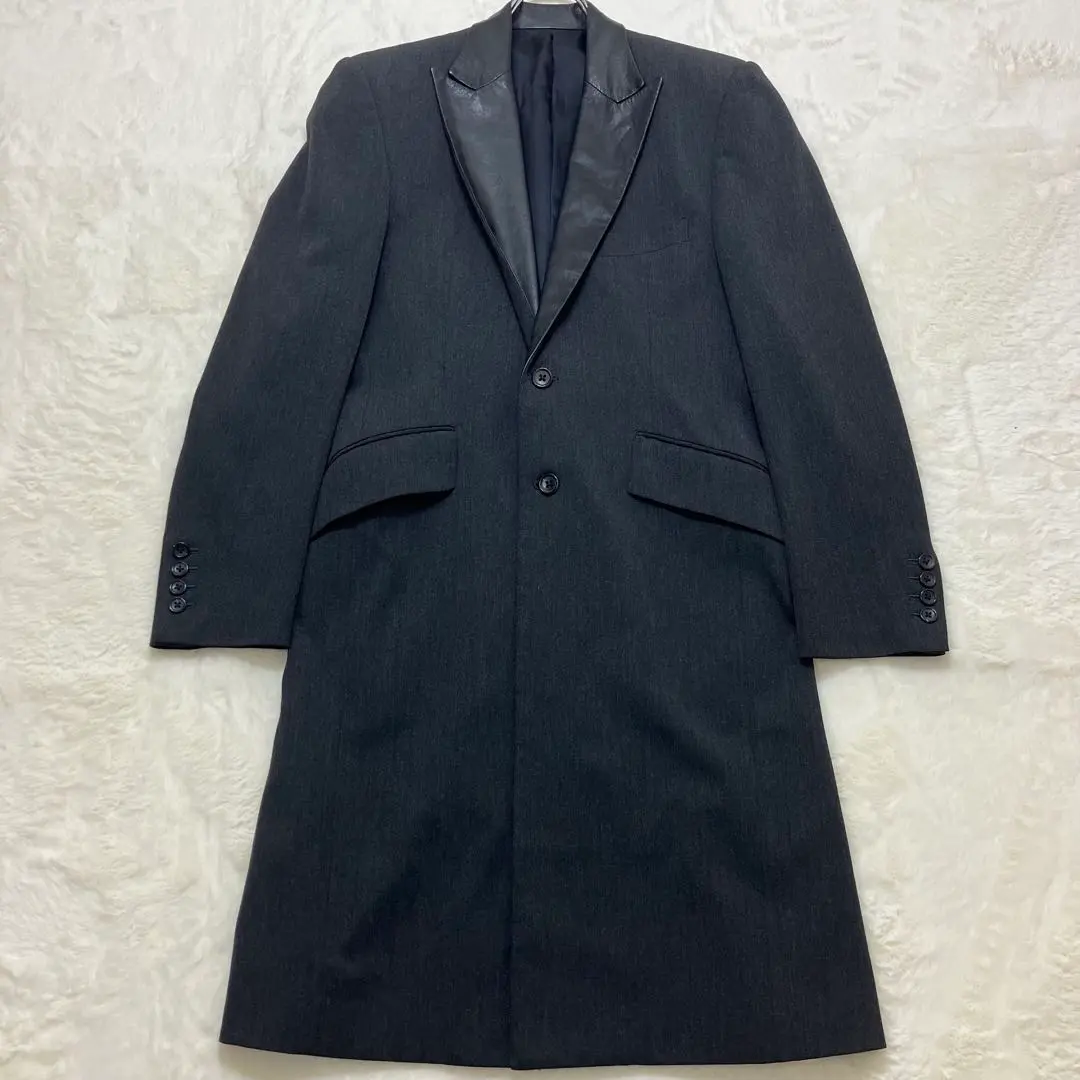 美品 5351プールオム ラペルレザー切替 チェスターコート チャコールグレー