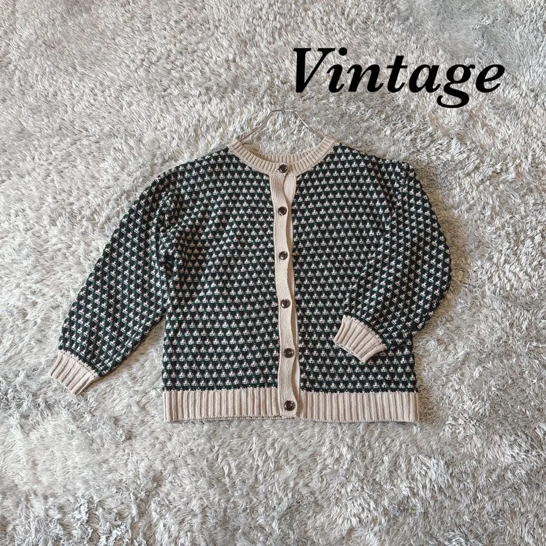ヴィンテージ ニットカーディガン ジオメトリック柄 総柄 厚手 クルーネック