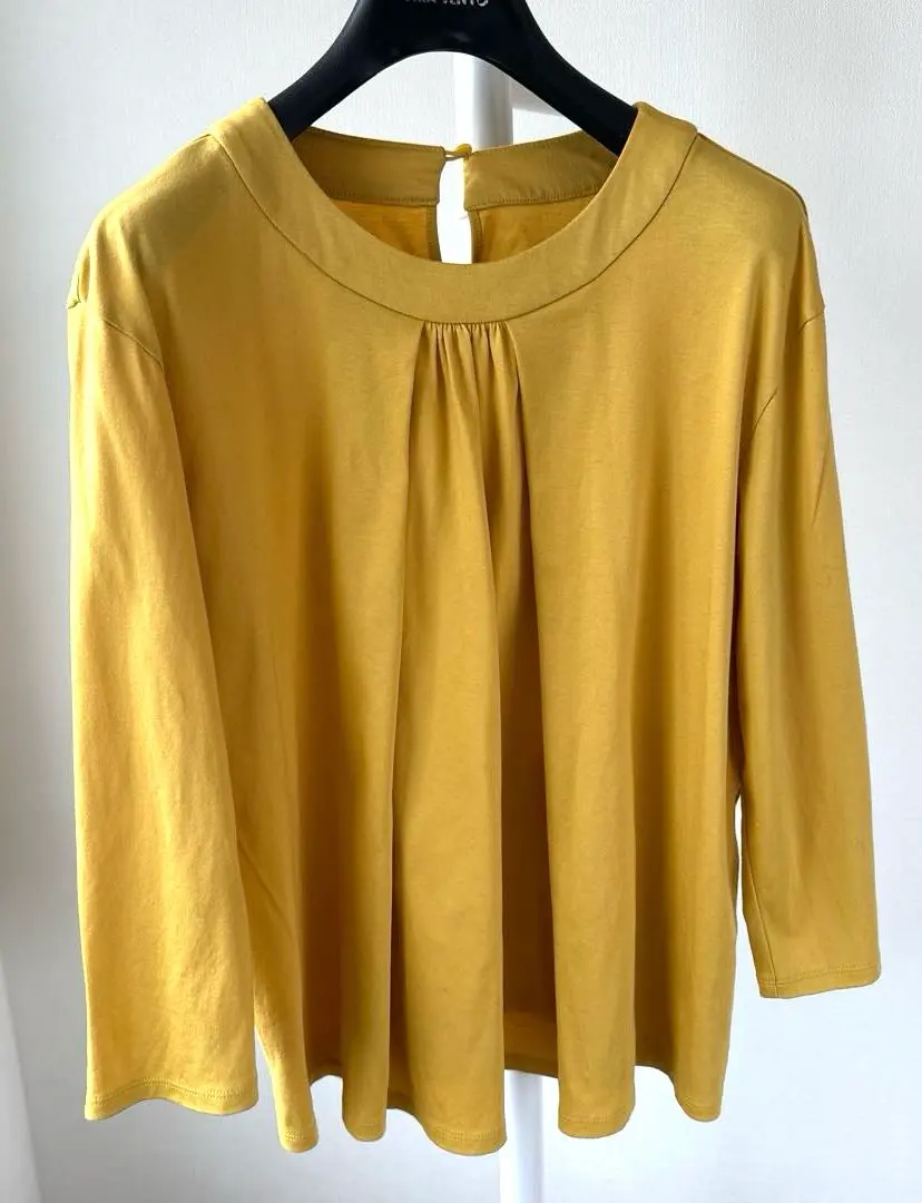 イエロー 五分袖 Tシャツ プリーツデザイン