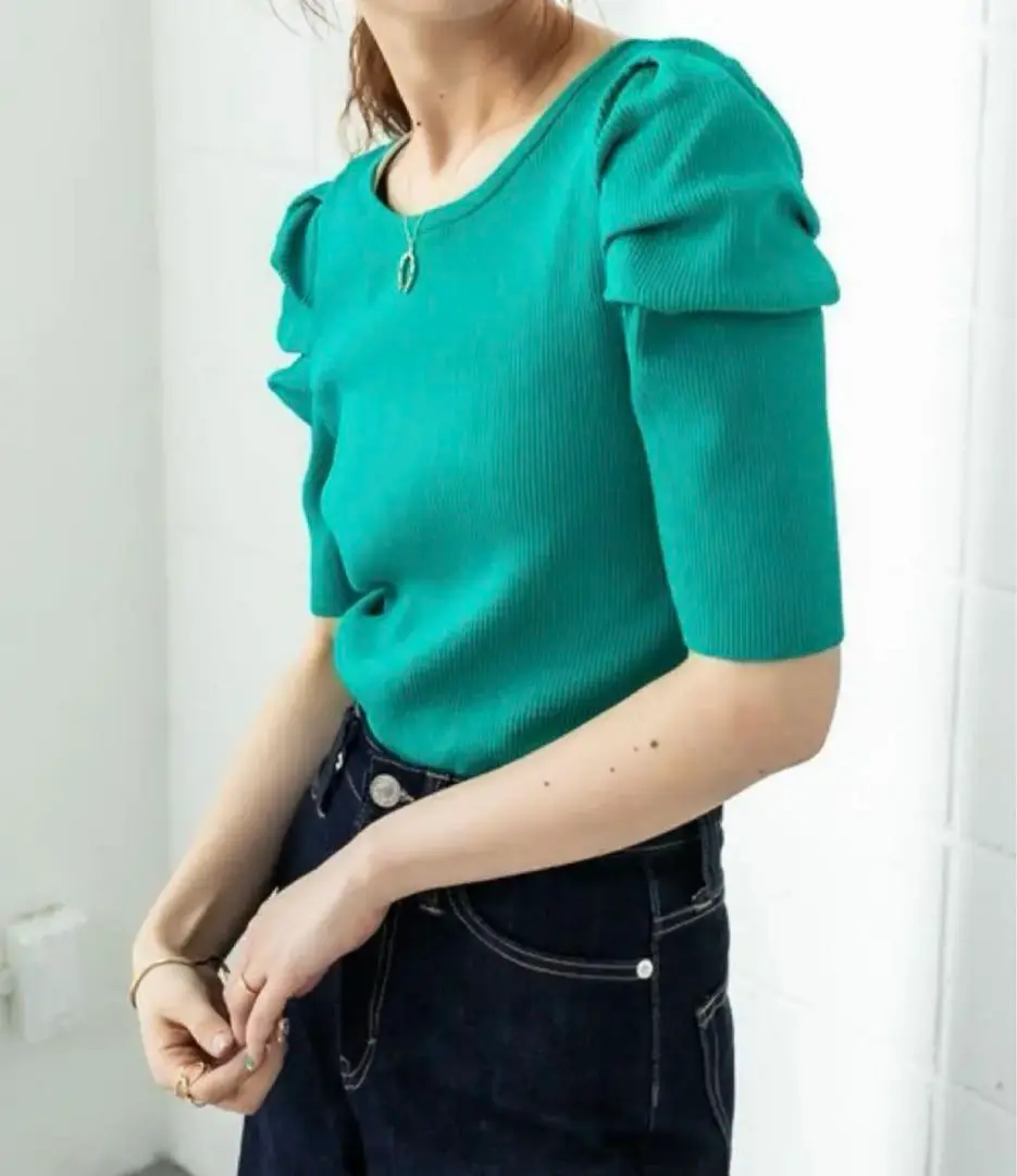 【美品】mystic パワショルリブ半袖ニット グリーン系