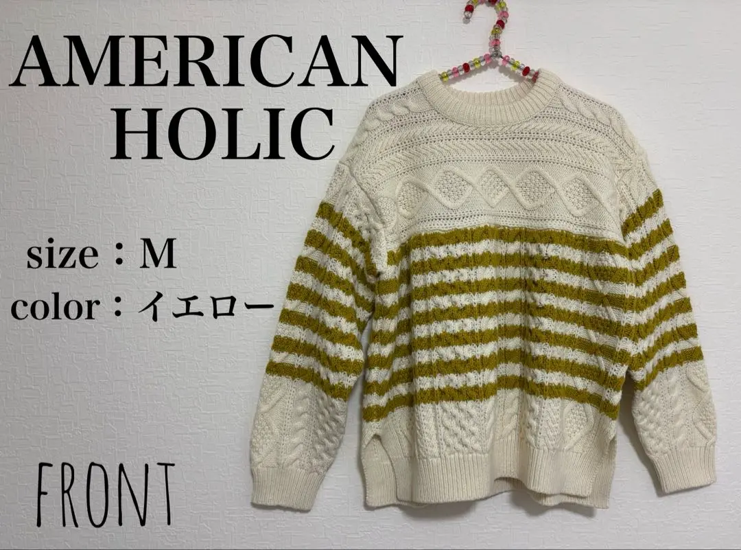 アメリカンホリック◆ケーブル ボーダー ニット プルオーバー イエロー Mサイズ