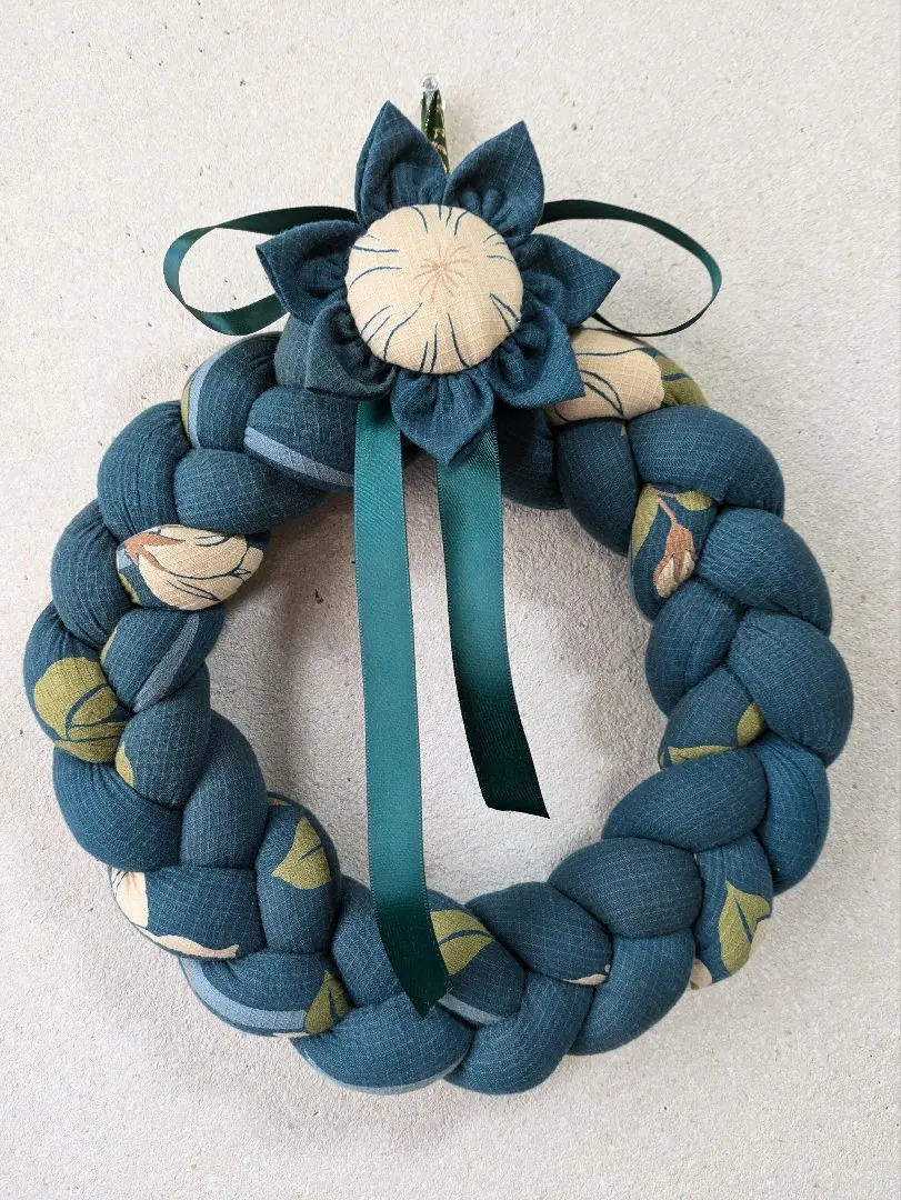✨クリスマスリース✨ グリーンの着物地を編んだ ハンドメイドのリース