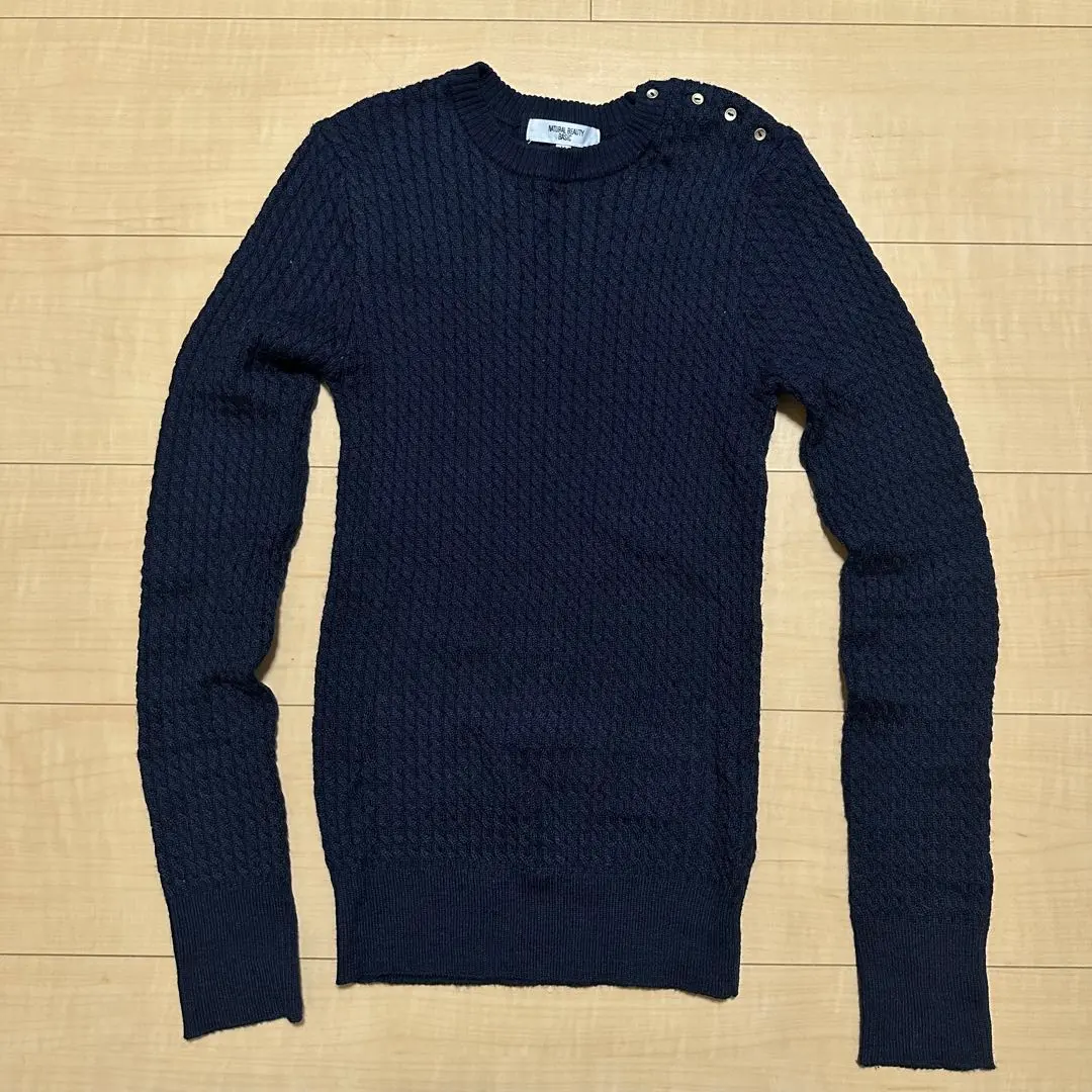 ナチュラルビューティーベーシック ニット 長 ケーブル編み M 紺 ネイビー