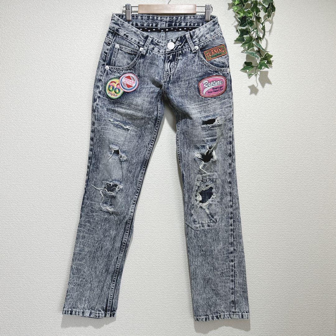 ダメージデニムパンツ ワッペン付き ストレート 25サイズ