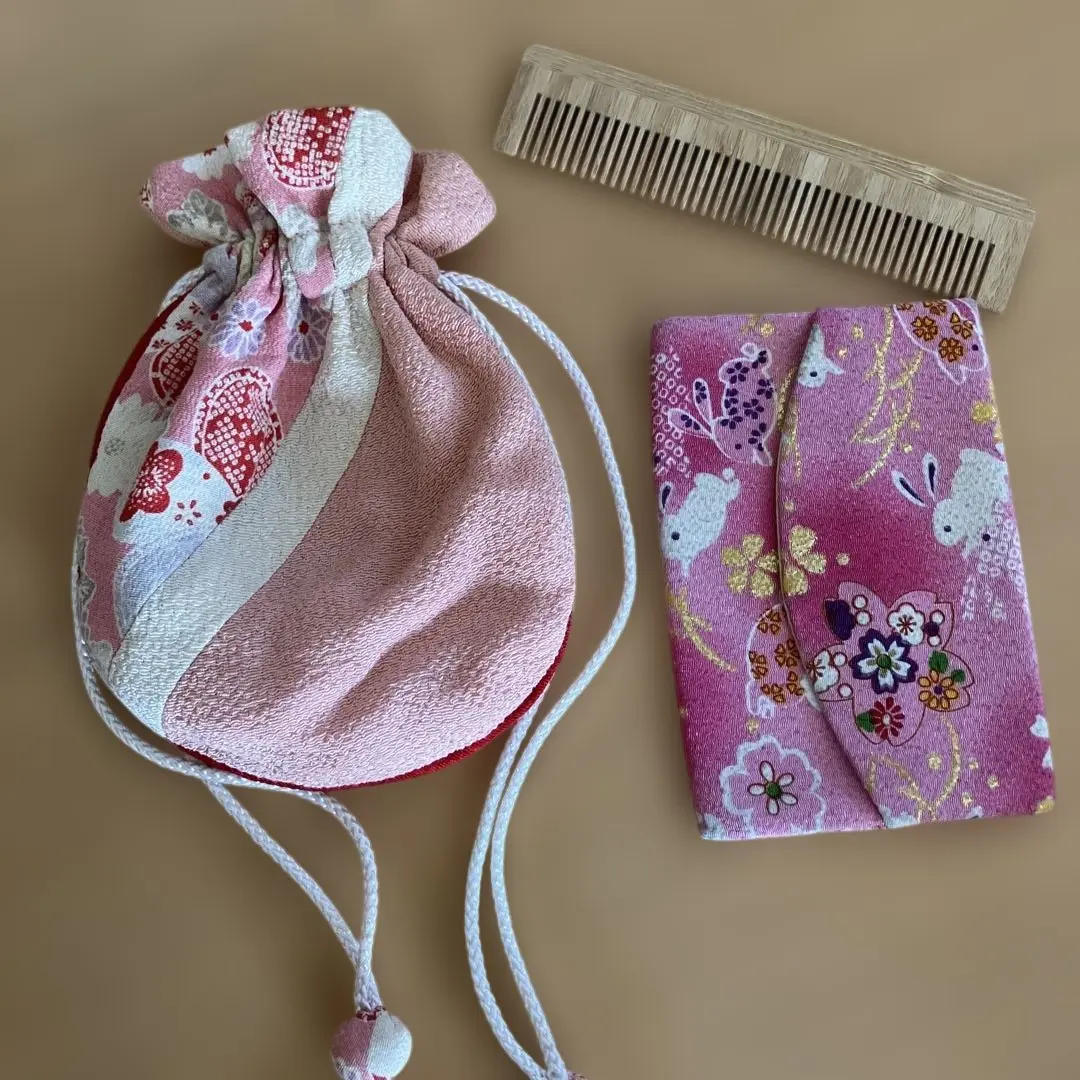 和柄巾着、ティッシュケース、竹製櫛 3点セット