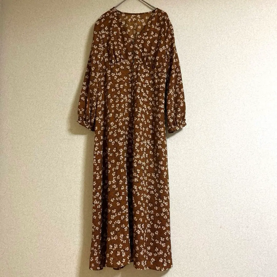ノーリーズ 花柄 長袖ワンピース Nolley’s ブラウン 春秋