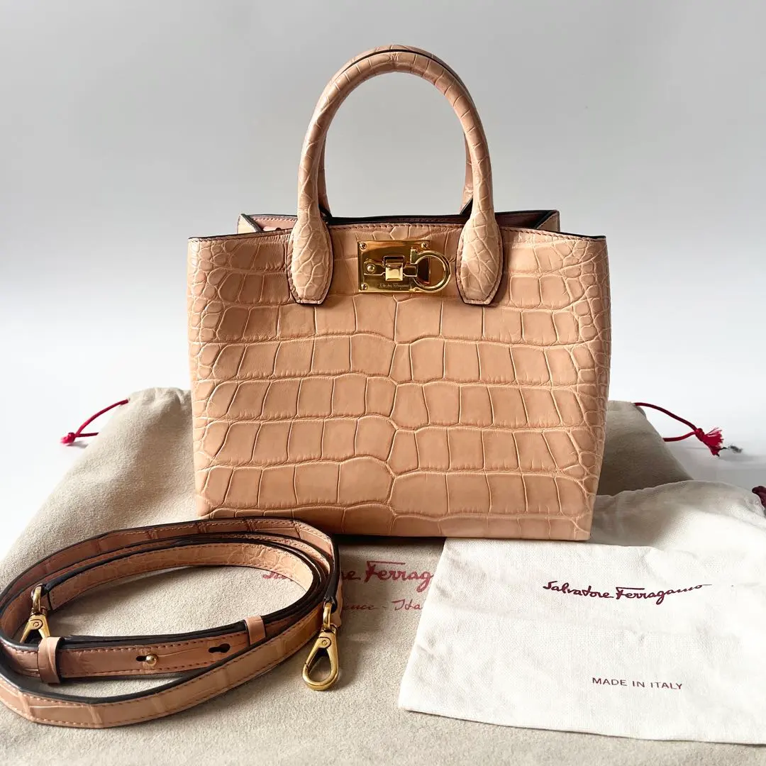 フェラガモ クロコダイル スタジオ ボックス バッグ 2way ピンクベージュ