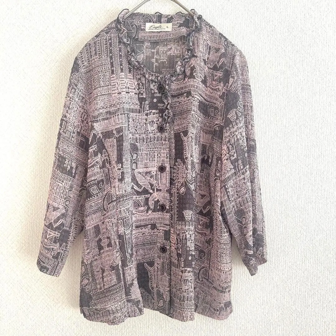 美品✨【イーグル】ノーカラーブラウス 七分袖 首元フリル 総柄 ミセス サラサラ