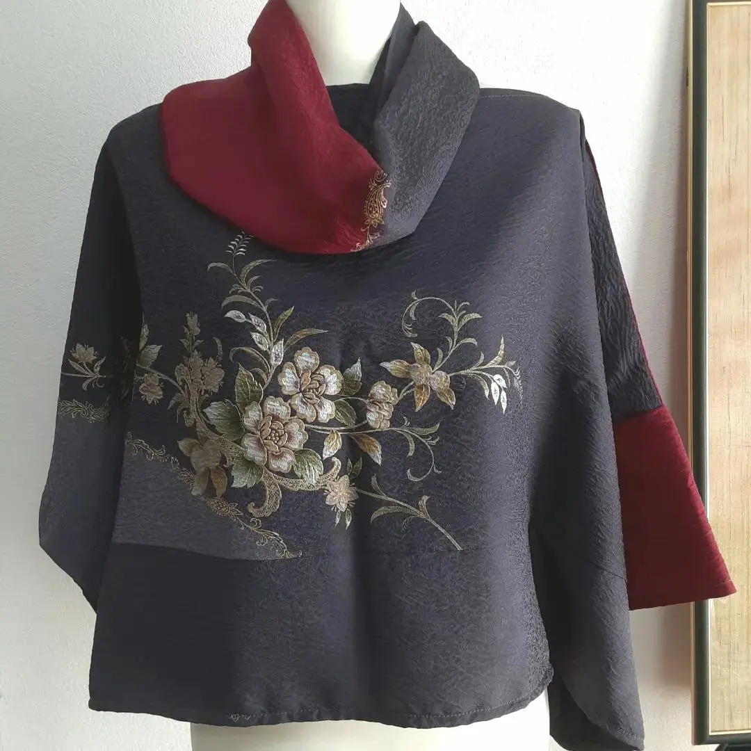 リメイク着物ポンチョ風チュニック泥大島紬龍郷フリーサイズ