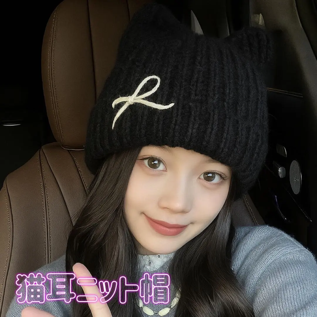 ニット帽 猫耳 猫 帽子 ケーブル編み 防寒 小顔効果 リボン レディース 冬