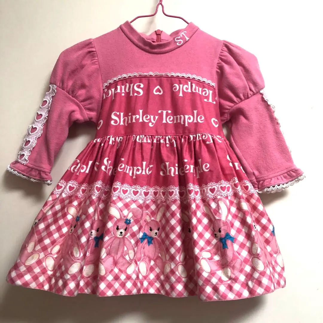 シャーリーテンプル ギンガムチェック うさぎ パフスリーブ長袖ワンピース 80