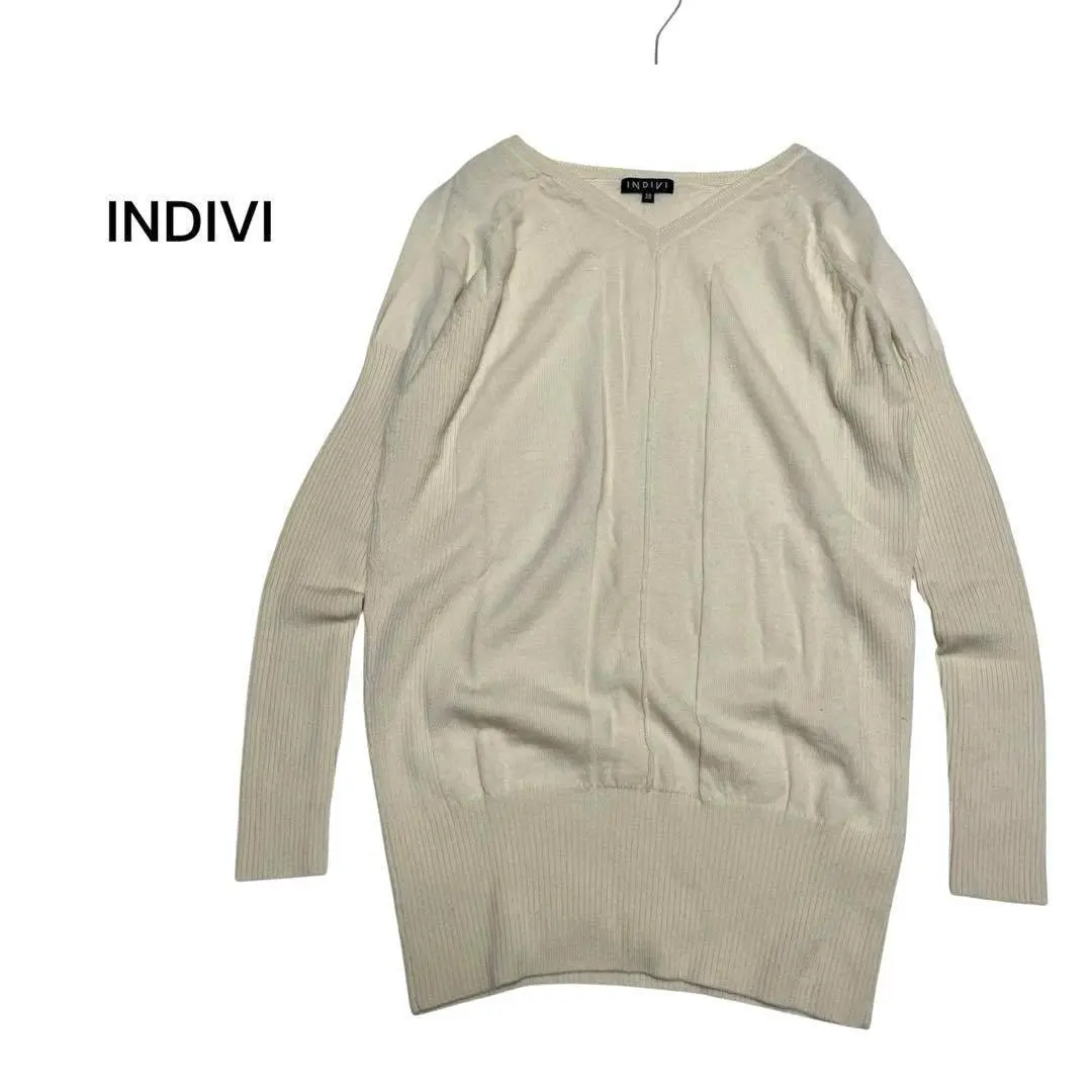 インディヴィINDIVI Vネック ロングニット セーター38毛100%ホワイト