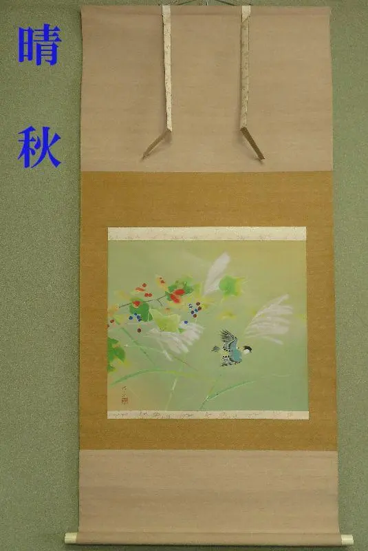 掛軸 『晴秋』 共箱 作者詳細不詳 【秋 渉禽図 鳥 ススキ】