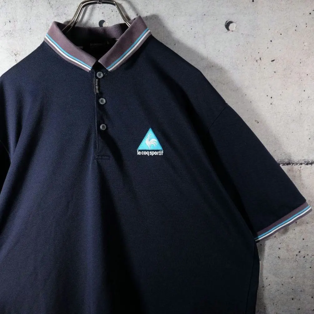 【古着】 ビンテージ ポロシャツ 刺繍 ワンポイント リンガー レトロ ネイビー