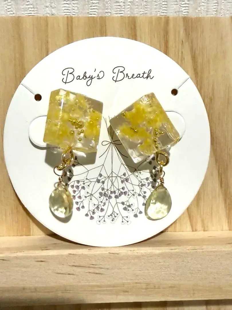 レジン製 イエロー 花 天然石 レモンクォーツ 樹脂イヤリング ハンドメイド