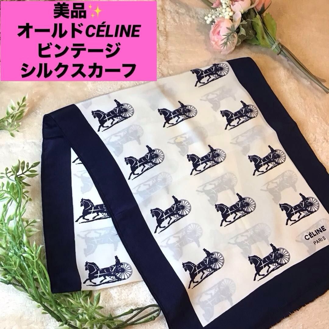 美品 オールドCÉLINE 馬車と馬 ビンテージ シルクスカーフ セリーヌ