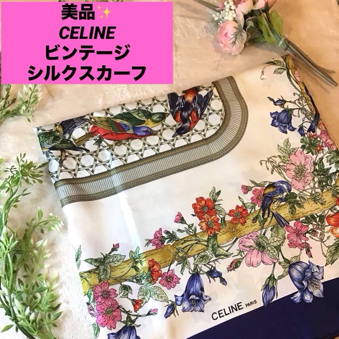 美品 CELINE 花と鳥のプリント 大判 スカーフ セリーヌ