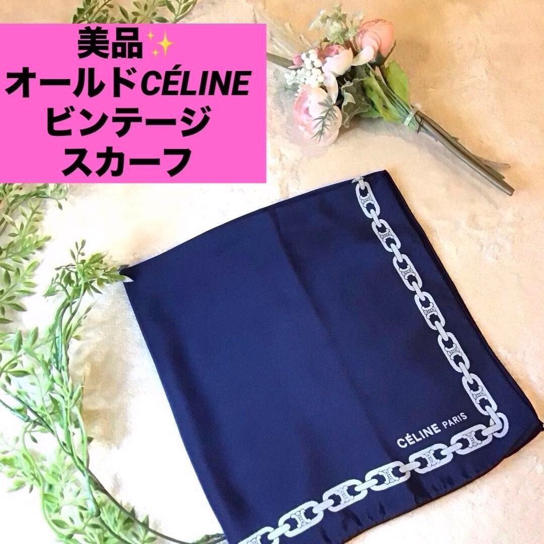 美品 オールドCÉLINE ビンテージ スカーフ ハンカチ チェーンパターン ネイビー
