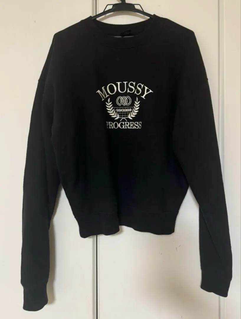 MOUSSY ブラック クルーネック スウェット ロゴ入り黒トレーナー